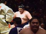 勝ち名乗りを受ける力士が、軍配の上にのせられた